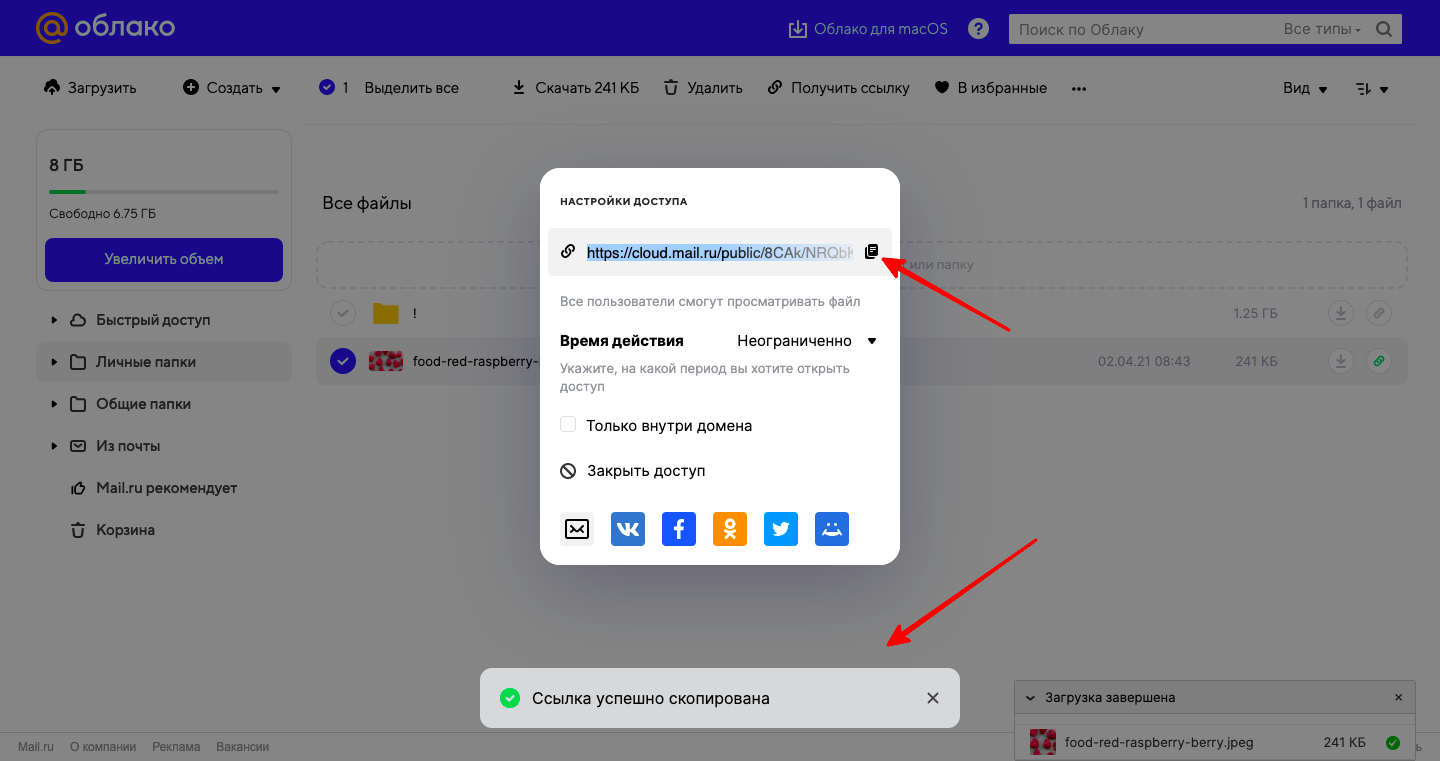 После того как файл загрузится в Облако, кликаем на файл, клик правой кнопкой мыши, выбираем “Открыть доступ по ссылке”