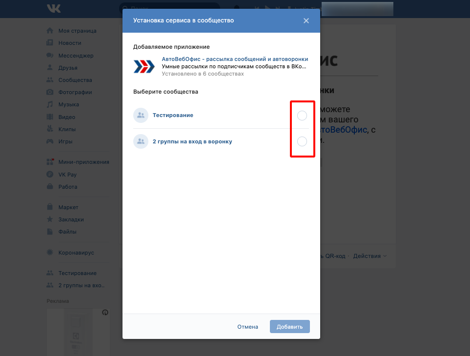 5. Выбрать ВК-сообщества для установки приложения, нажать кнопку «Добавить»