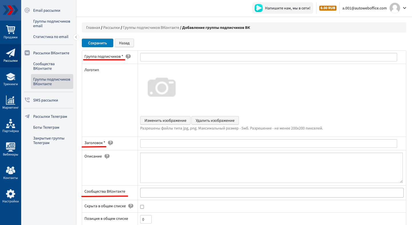 2. Нужно заполнить поля новой группы (название группы, выбрать логотип группы, заголовок, добавить описание, выбрать сообщество, к которому подключено приложение в ВК и остальные поля при необходимости)