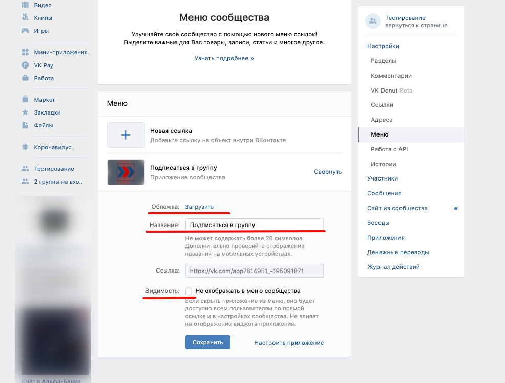 В меню на главной странице сообщества, можно изменить обложку, название, видимость подключенного приложения в ВК- сообществе