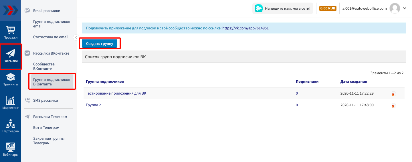 1. Перейти по ссылке из раздела Рассылки→Группы подписчиков ВКонтакте