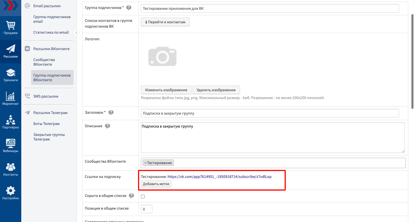 6. В поле «Ссылки на подписку» появится ссылка на страницу подписки в группу в ВК