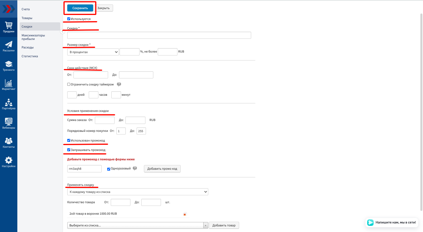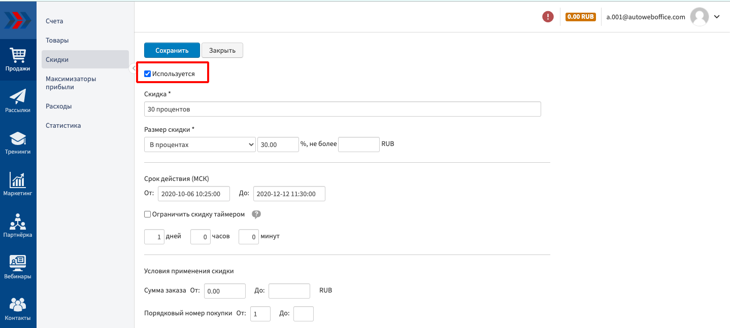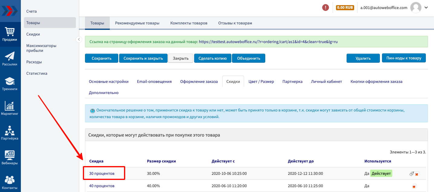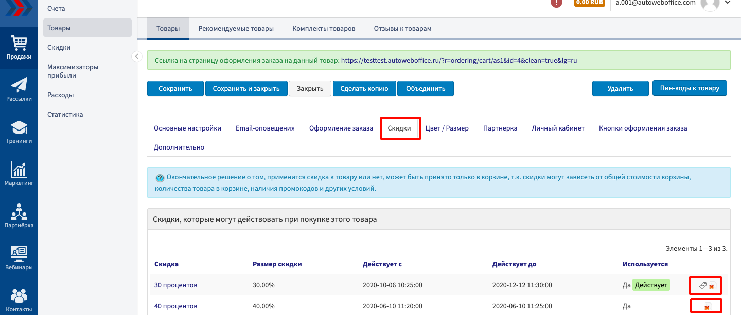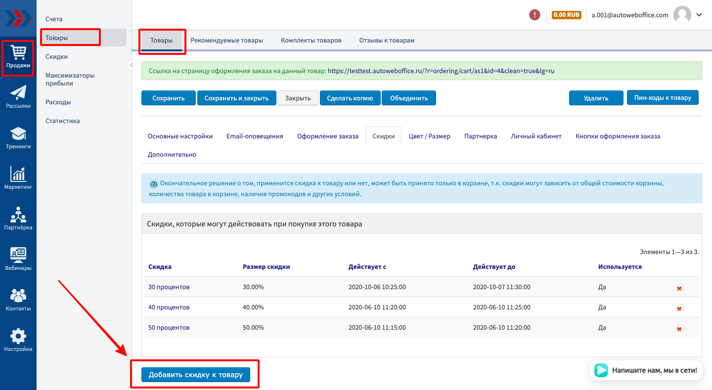 Если Вам необходимо устроить праздничную распродажу реализуемых Ваши магазином товаров и услуг или просто провести какую-либо маркетинговую акцию, то Вы можете сделать это используя механизм «Скидки к товару» на странице изменения информации по уже созданному товару или услуге. С помощью механизма «Скидки к товару» к товару, Вы можете создавать, редактировать и удалять созданные ранее дополнительные скидки к товарам и услугам.