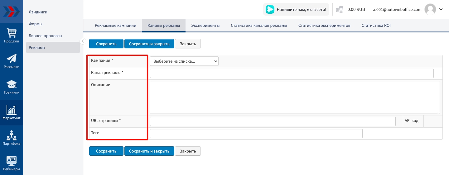Важно! Создание «Каналов рекламы» возможно только в случае если Вы уже добавили хотя бы одну рекламную кампанию для Вашего магазина, зарегистрированного в сервисе АвтоВебОфис.