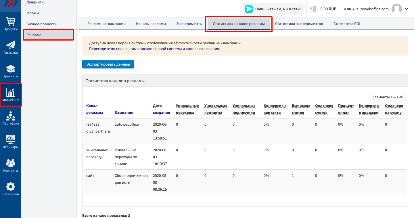 Если Вам нужно определить эффективность для Вашего бизнеса того или иного рекламного источника, с которого идут посещения Вашего сайта, Вы можете использовать инструмент АвтоВебОфиса «Каналы рекламы».