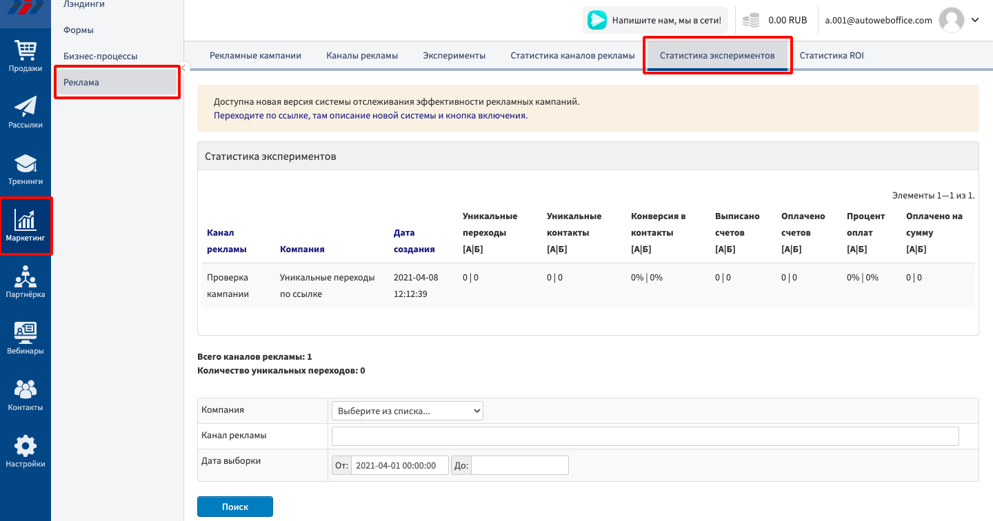 Чтобы получить сводную информацию по эксперименту, в меню найдите раздел «Маркетинг» - «Реклама». Далее необходимо перейти в раздел «Статистика экспериментов»