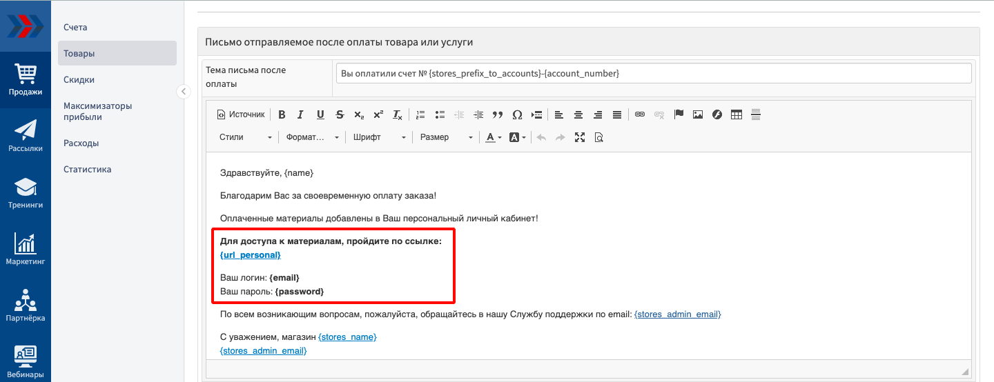 На странице редактирования нужного товара выбираем вкладку «Email-оповещения», в блоке «Письмо отправляемое после оплаты товара или услуги» в тело письма вставляем специальную заготовку, которая будет отвечать за ссылку на доступ в Личный кабинет, а также логин и пароль. Для этого необходимо вставить регулярные выражения, отвечающие за вход в личный кабинет.