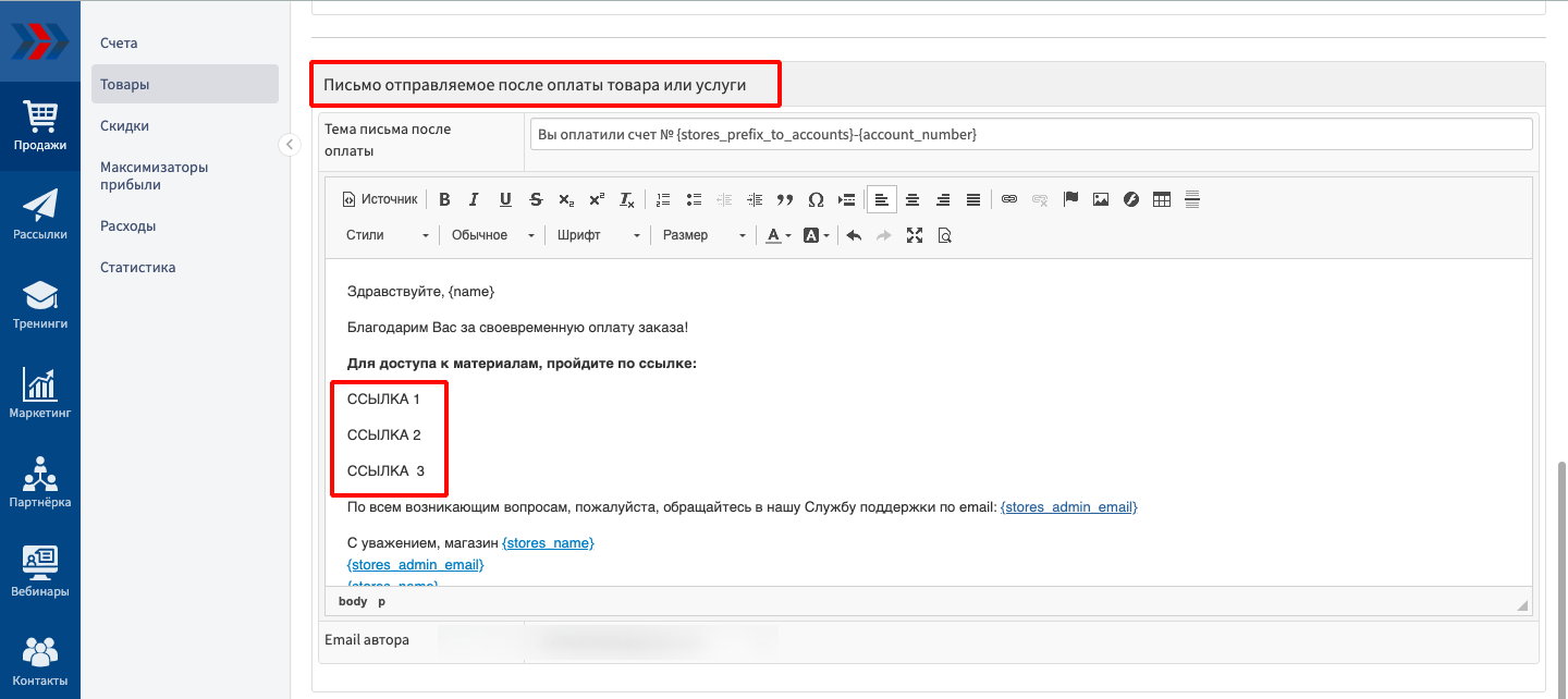 На странице редактирования нужного товара выбираем вкладку «Email-оповещения», в блоке «Письмо отправляемое после оплаты товара или услуги» и в теле письма указываем ссылки на скачивание и нажимаем кнопку «Сохранить»