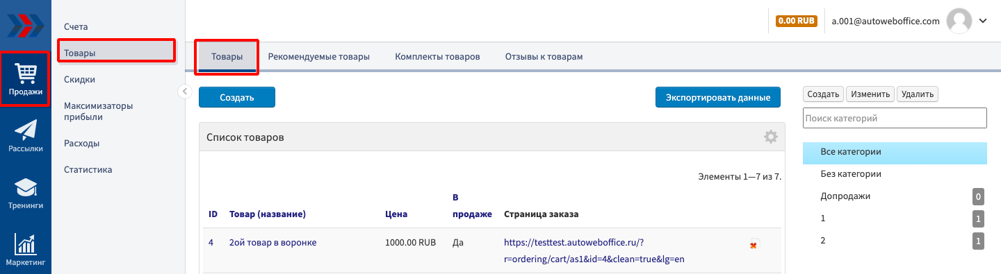 Для настройки нужного способа доставки инфотовара в CRM АвтоВебОфис нужно перейти в пункт «Товары» в разделе «Продажи» и выбрать нужный товар: