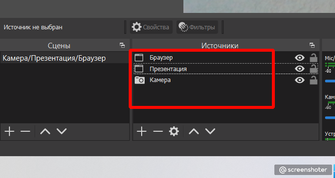 В каждой сцене несколько источников данных - презентация, камера, окно браузера и т.д. Во время показа сцены их можно переключать: