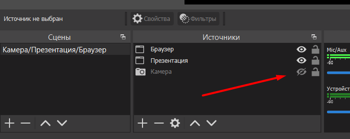 В процессе ведения живого вебинара отображение окон вывода изображения презентации/браузера/камеры можно отключить, нажав на значок глаза здесь, и включить отображение тогда, когда это понадобится: