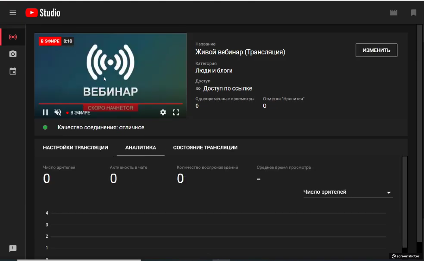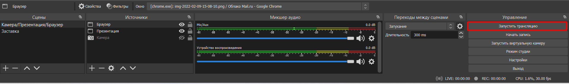 После этого зайдите в свой YouTube канал и дождитесь пока система обновится и подключит экран из кодера OBS. При переключении экранов кодере OBS в трансляции на YouTube они так же будут меняться.