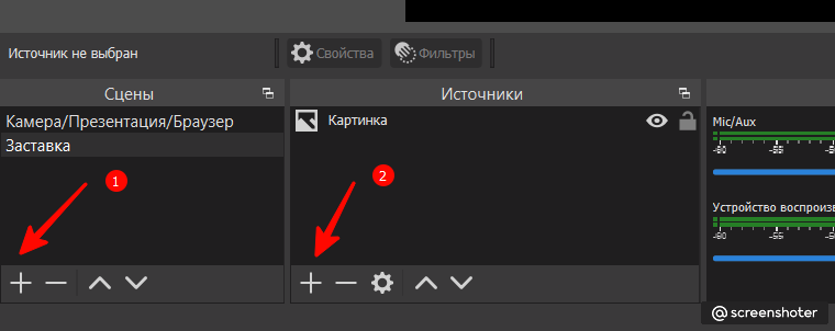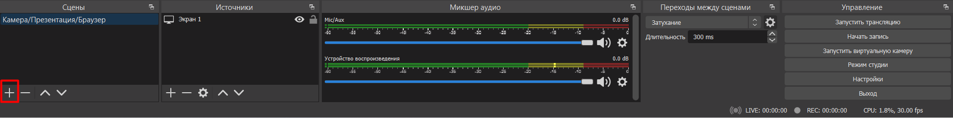 Перед нами черная область - здесь будет отображаться то, что пойдет в трансляцию. Она называется сцена. Сцены создаются в нижнем черном окошке (левый нижний угол). Сцен может быть несколько, между ними можно переключаться.