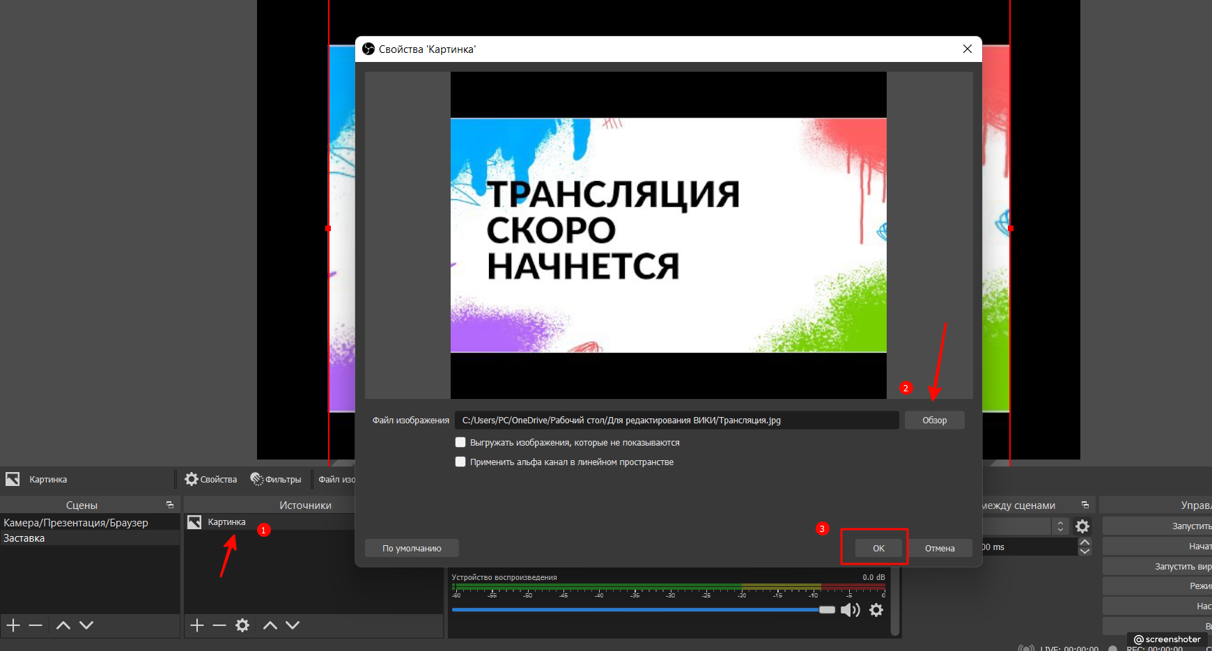 До начала вебинара, в процессе ведения вебинара и после, Вы можете настроить сцену заставки, для этого выбираем еще одну сцену обозначим ее как «Заставка» в Источнике выбираем элемент «Картинка» кликаем по ней 2 раза и из появившегося окна, выбираем нужную вам картинку.