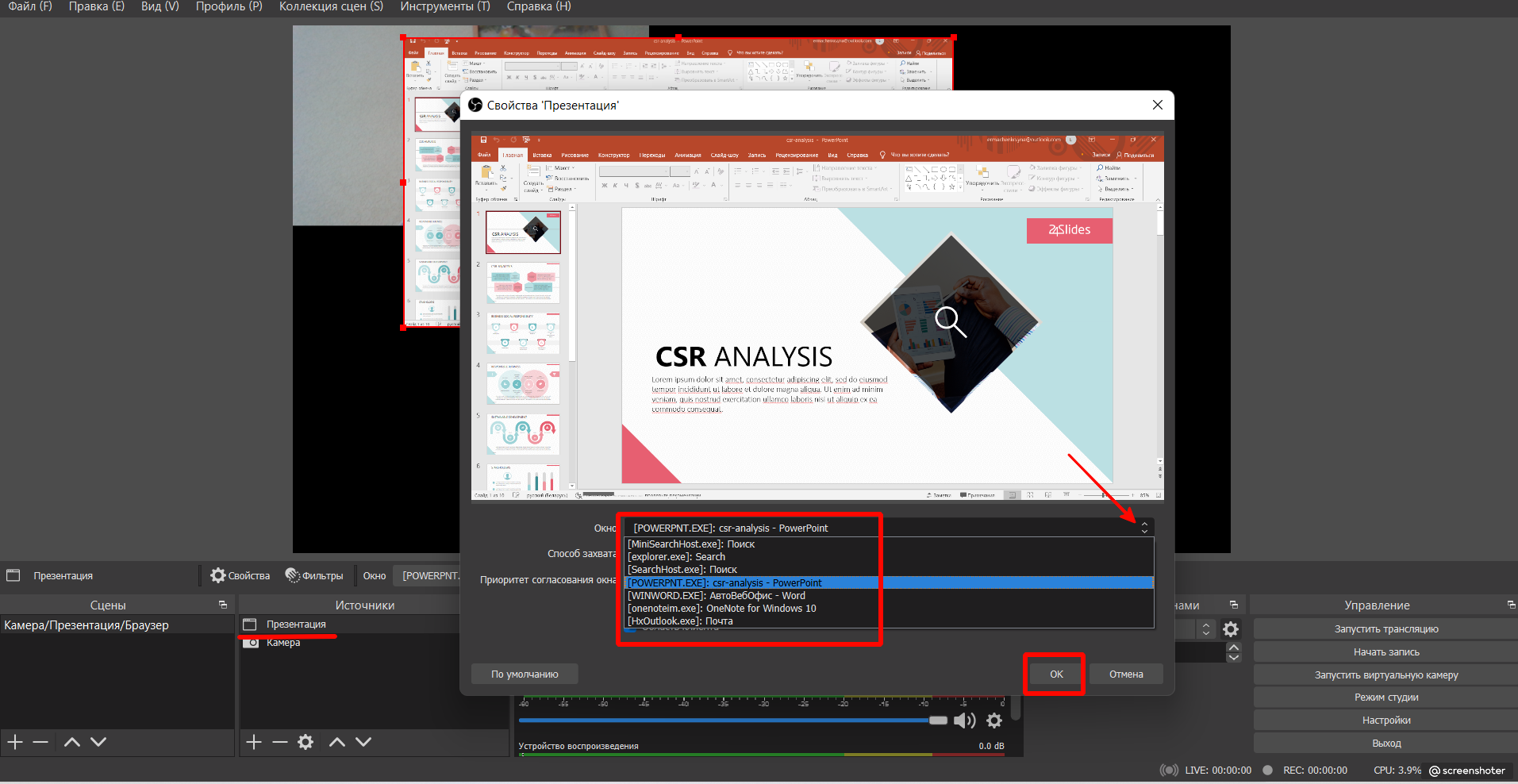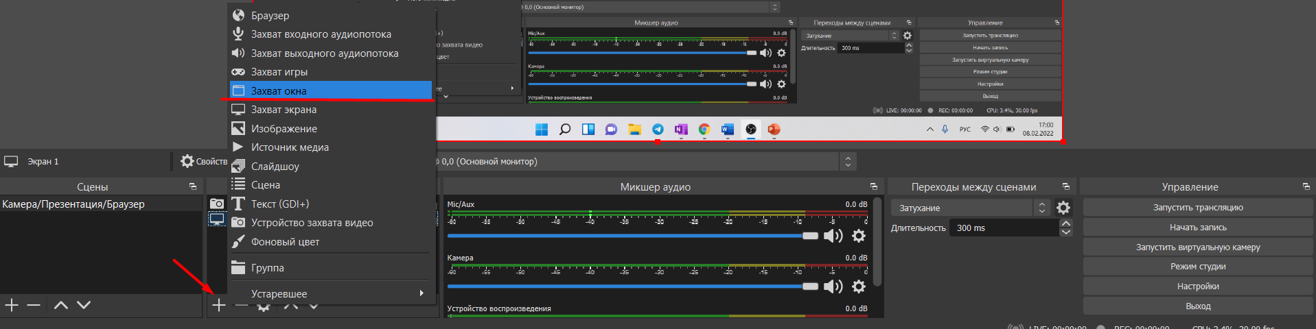 4. Добавить («+») в блоке «Источник - Захват окна». Переименовать его в Браузер и выбрать из списка наименование для трансляции. Нажать кнопку «Ок».