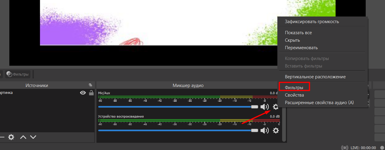 В блоке «Микшер аудио» жмем на значок шестеренки. Выбрать пункт «Фильтры»: