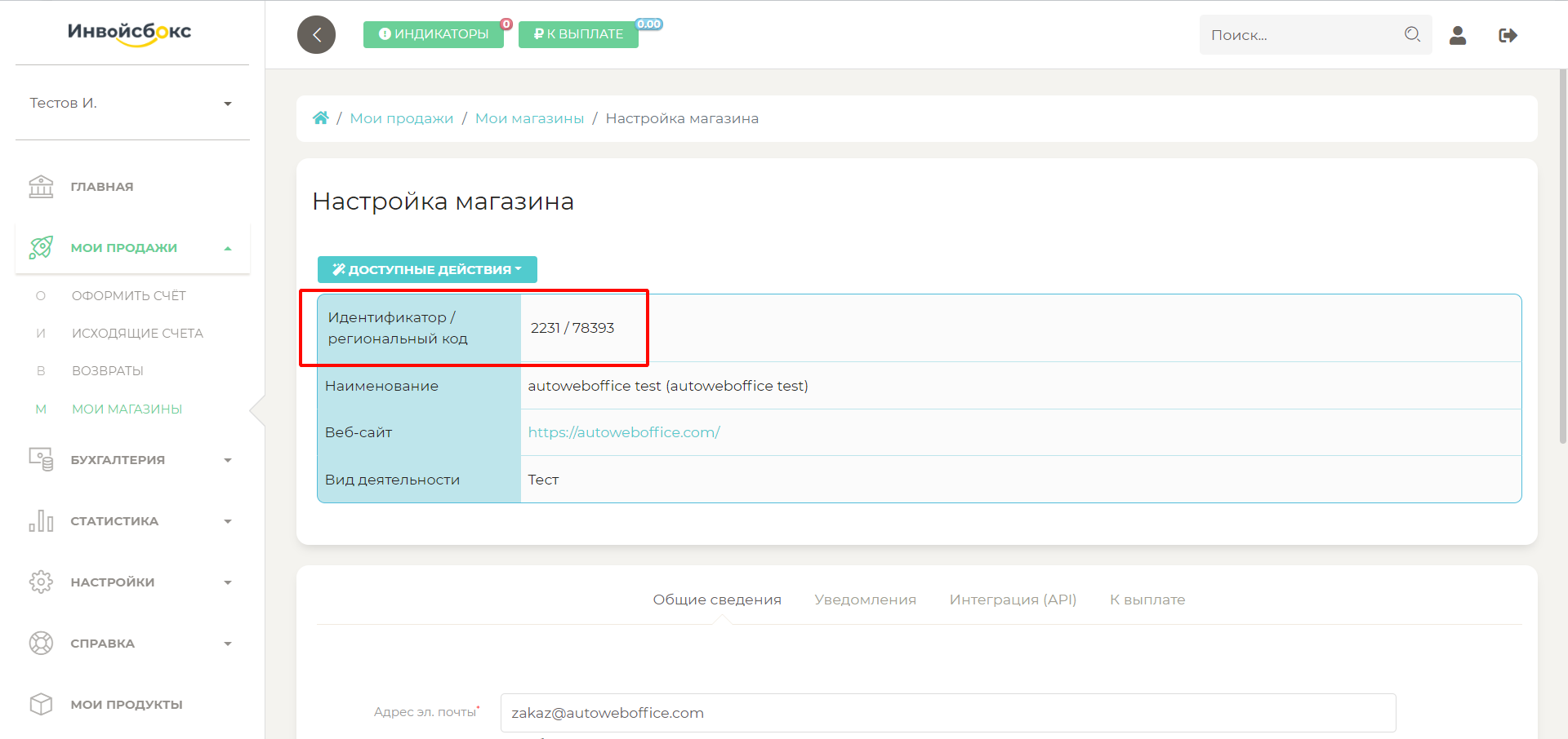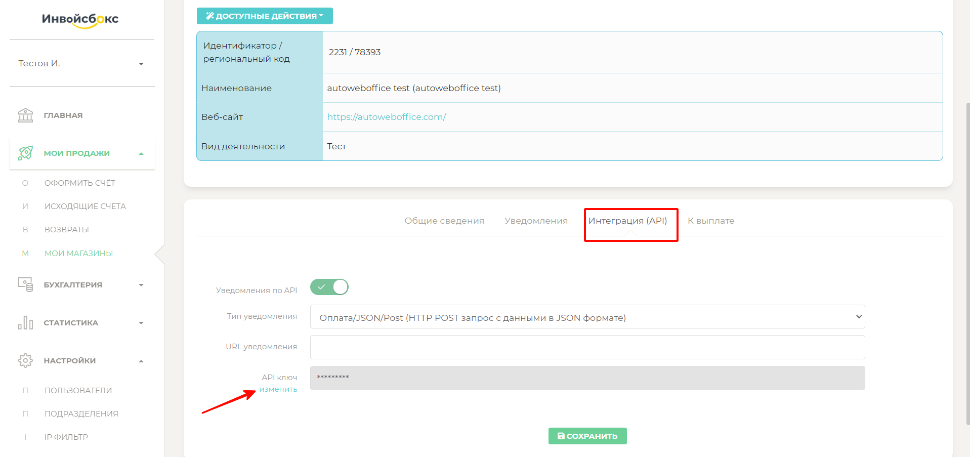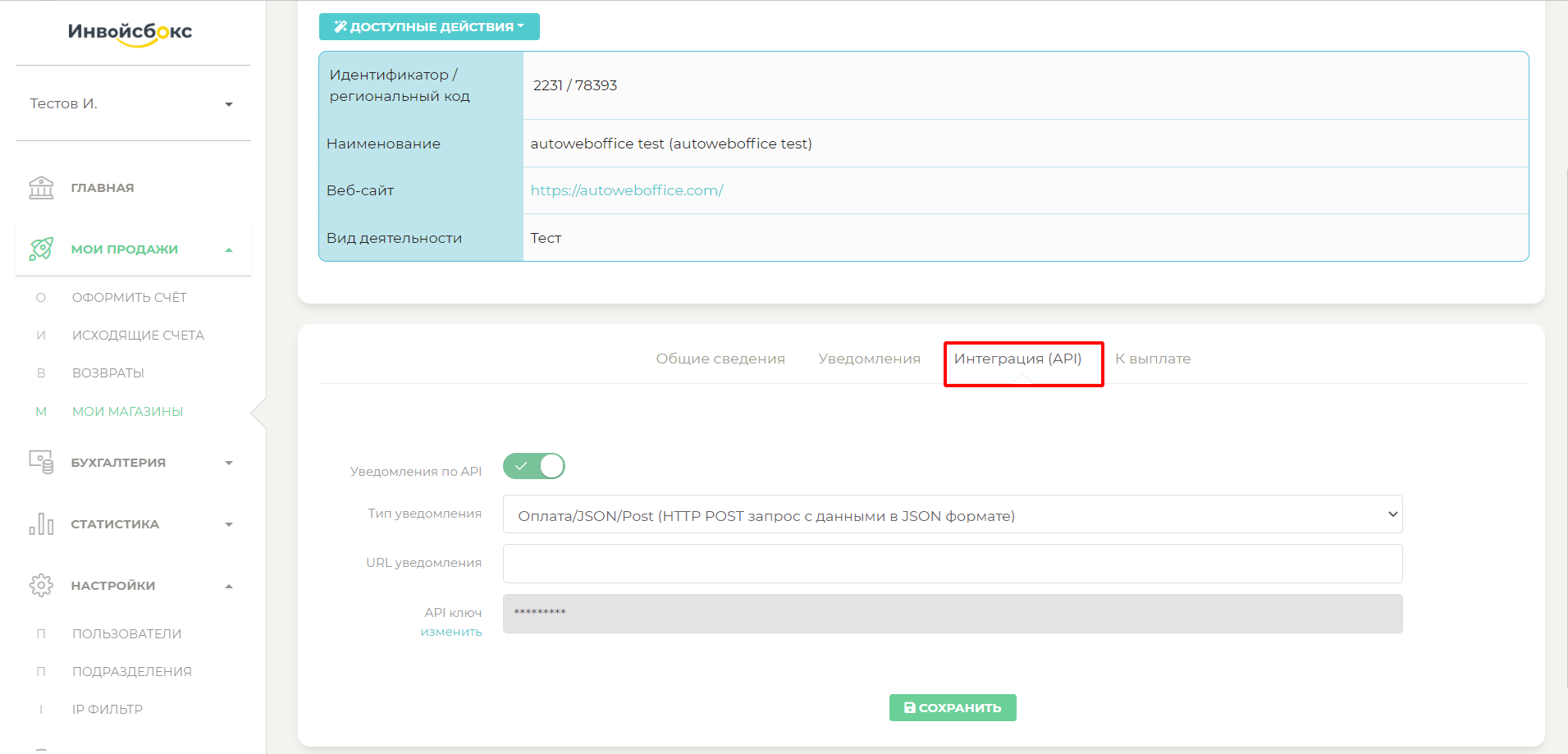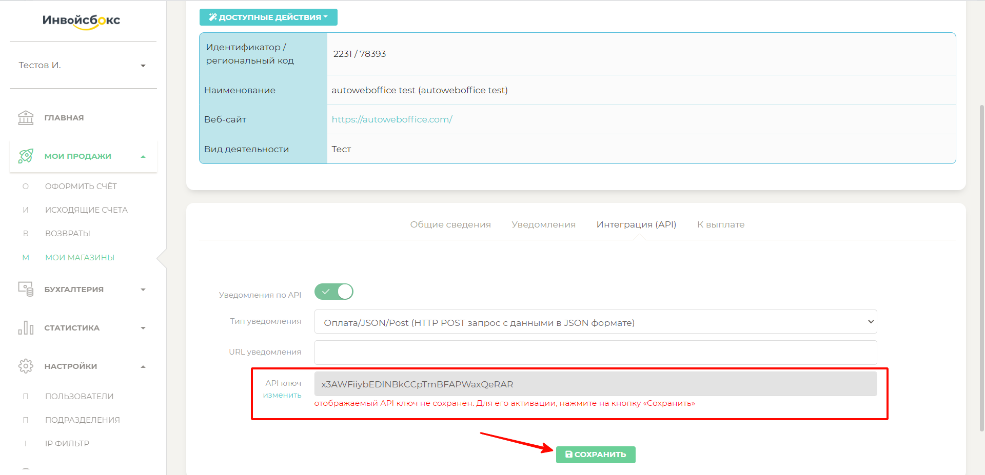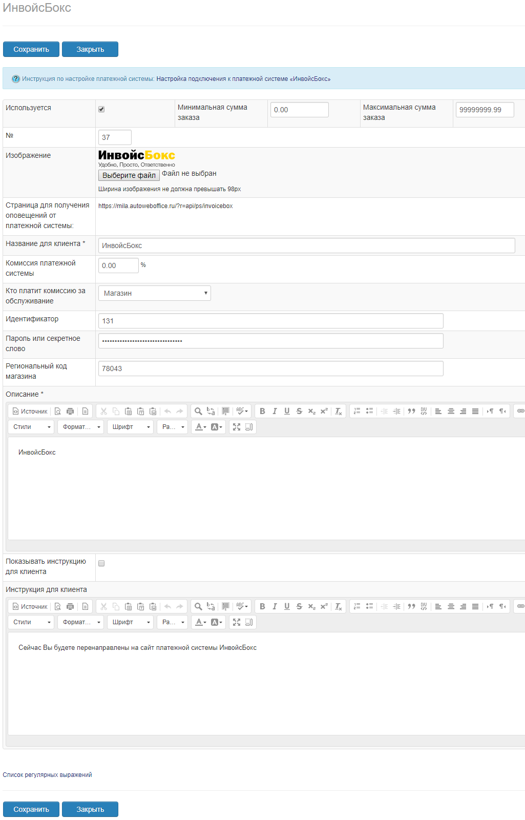 На этом настройки подключения к платежной системе ИнвойсБокс на стороне платежной системы ИнвойсБокс завершены, переходим к настройкам на стороне магазина, созданного в сервисе АвтоВебОфис.