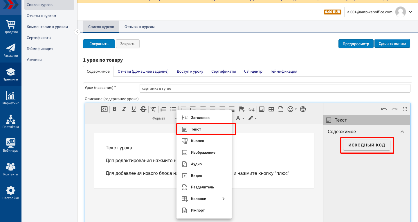 3. Заходим в нужный урок в системе АвтоВебОфис, нажимаем на «+» на блоке урока, выбираем текстовый блок урока и вставляем код в редакторе в боковом меню, справа в «Содержимое → Исходный код»