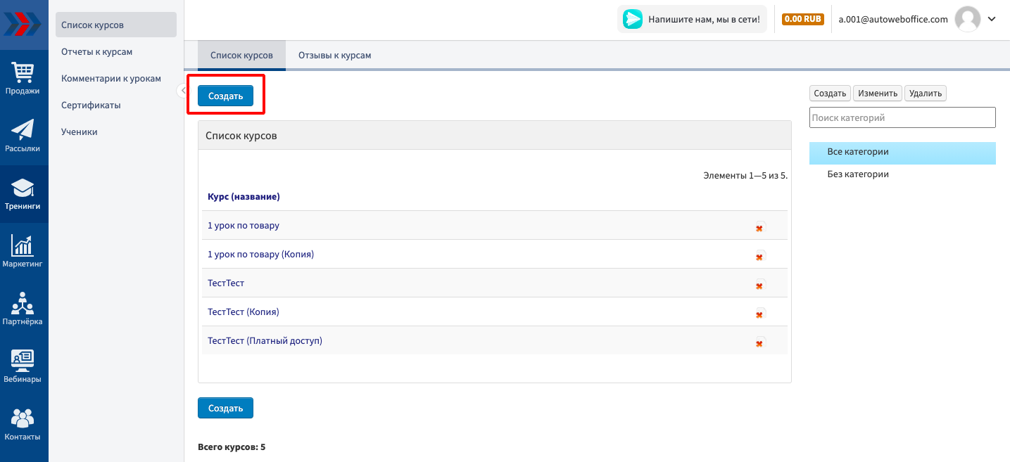 2. Вы попадете на страницу со списком всех обучающих курсов, существующих в Вашем аккаунте. Нажмите на кнопку «Создать».