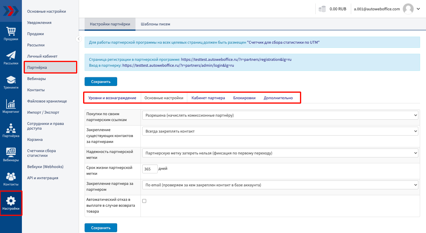 Чтобы попасть в Настройки партнерской программы, зайдите в Ваш аккаунт в системе CRM АвтоВебОфис-Настройки-Партнерка. Там Вы увидите 5 вкладок: