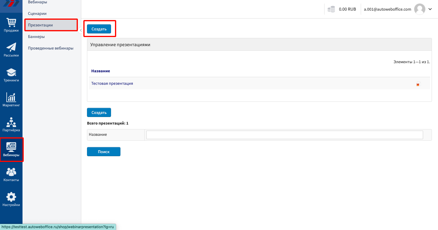 На странице управления презентациями нажмите кнопку «Создать»