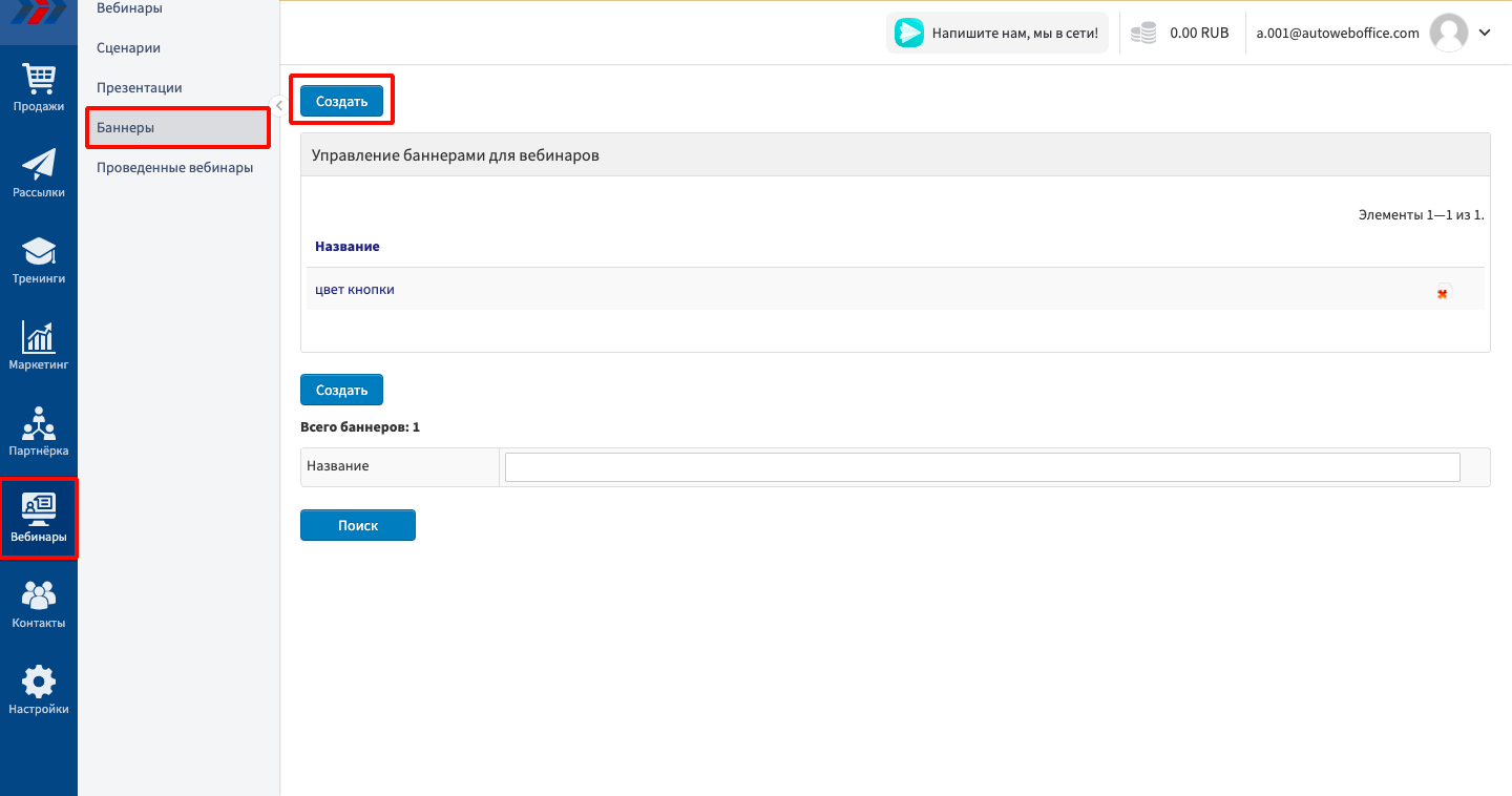 Для создания баннера на панели управления Вашим аккаунтом выберите пункт «Баннеры» в разделе «Вебинары».