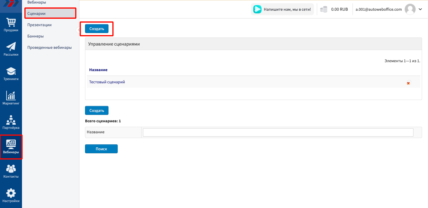Чтобы создать новый сценарий, перейдите в раздел «Вебинары» - «Сценарии».