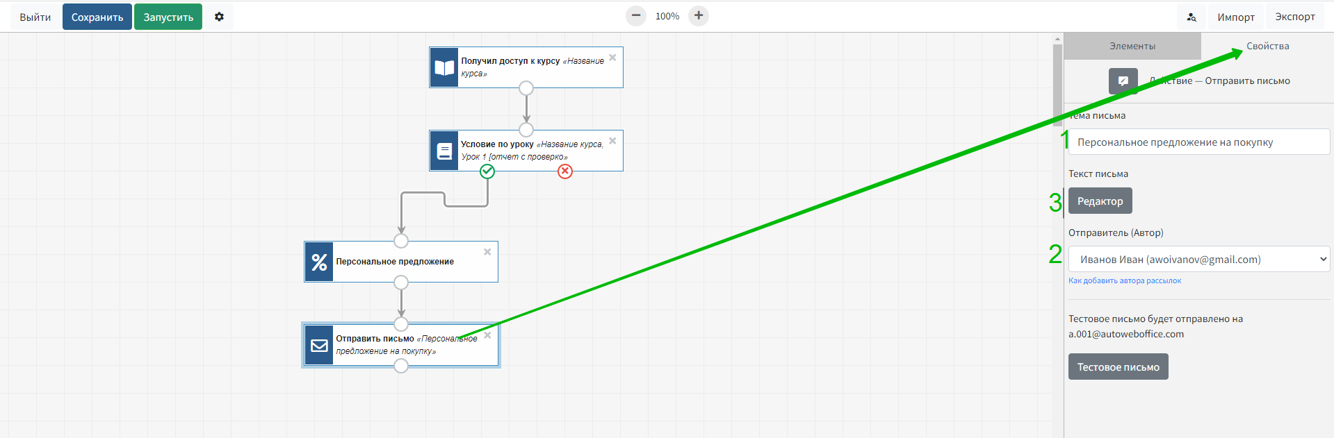 В первом письме следует поработать с возражениями клиента, связанными с самим курсом: убедить пользователя в том, что курс действительно работает так, как о нем говорят. В свойствах элемента отправки письма следует указать его (1) тему, (2) выбрать отправителя и (3) перейти в редактор для написания письма.