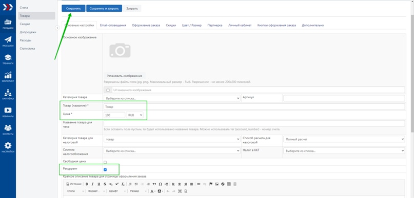 На странице создания товара следует указать название товара и его стоимость, установить галочку «Рекуррент» и сохранить изменения.