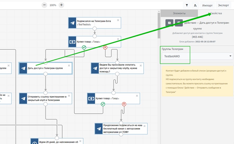 Данная ветка начинается с действия, которым пользователю предоставляется доступ к Телеграм-группе. В свойствах этого элемента следует выбрать Телеграм-группу.