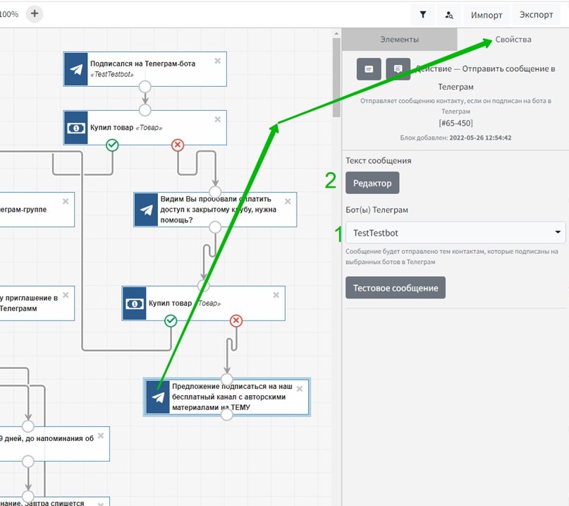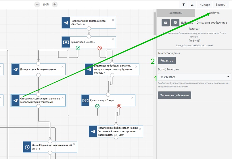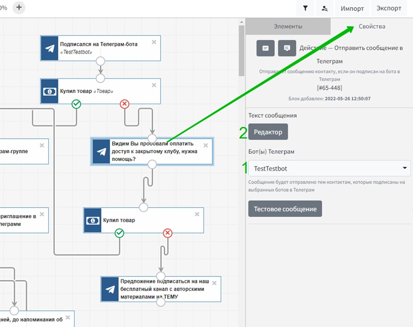 Далее нужно отправить пользователю ТГ-сообщение со ссылкой на закрытый Телеграм-клуб. В свойствах этого действия следует выбрать (1) бота и (2) перейти в редактор для составления сообщения.