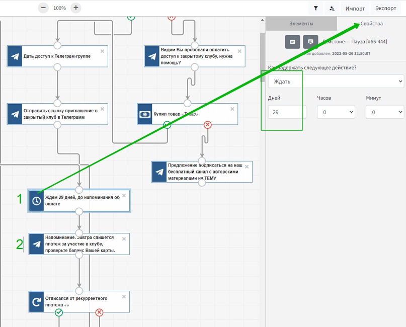 Теперь в процессе нужно разместить (1) элемент паузы продолжительностью 29 дней и (2) элемент отправки ТГ-сообщения, в котором пользователь получает напоминание о том, что завтра должно произойти списание с карты.