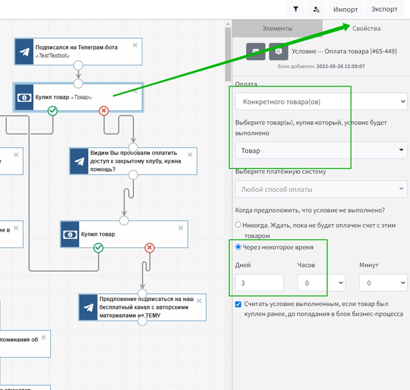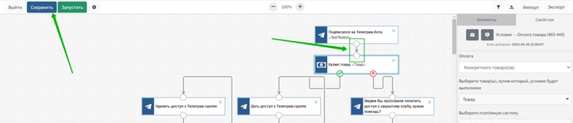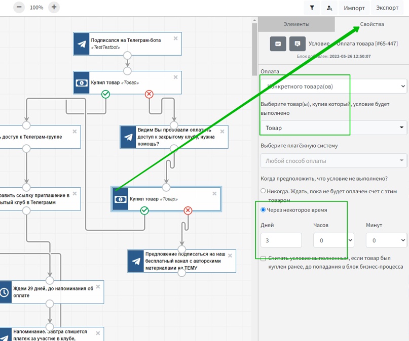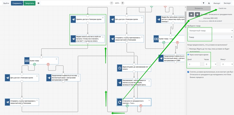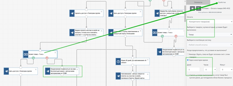 Теперь с помощью условия можно проверить, отписался пользовать от рекуррента или нет. В свойствах этого элемента следует указать «Конкретный товар» и выбрать его, а также дать время на выполнение условия. В случае отписки от рекуррента процесс сразу удаляет пользователя из Телеграм-группы и отправляет сообщение, в котором есть ссылка на оплату и комментарий, что оплата не поступила.