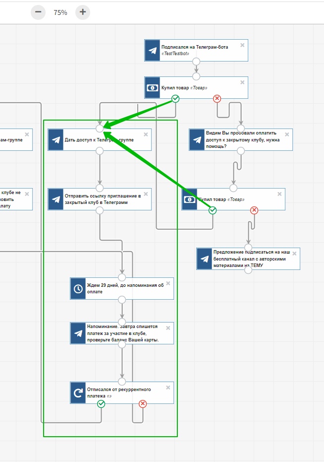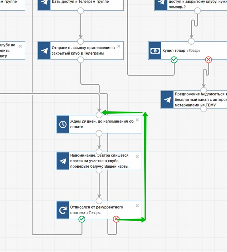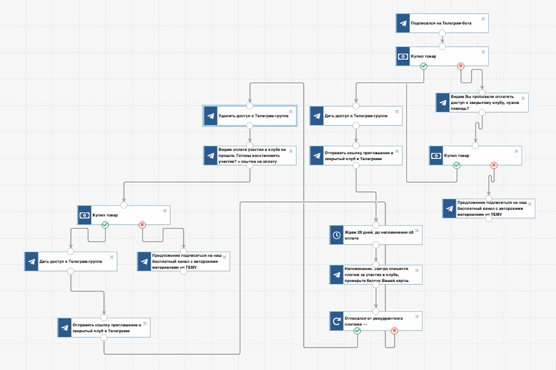 А если пользователь купил товар, он получает доступ к Телеграм-группе и сообщение со ссылкой в закрытый ТГ-клуб. Процесс же переходит в очередное ожидание следующего рекуррентного платежа.