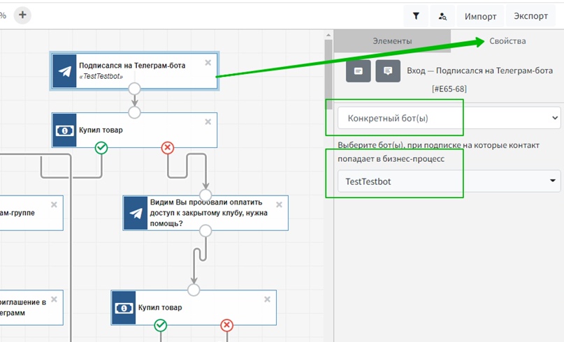 После размещения элемента в поле конструктора следует открыть его свойства, сделав двойной клик по нему. В свойствах следует выбрать «Конкретного бота» и указать его.